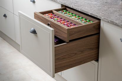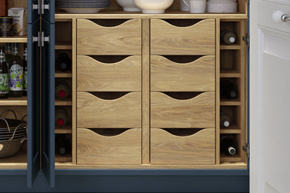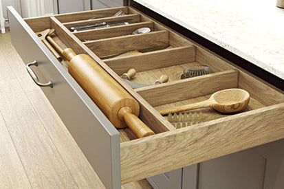 Masterclass kitchen drawers are available in three box drawer types – Portland Oak, Tuscan Walnut and modern Legrabox R-Designs – but we offer a lot more variation! Pridefully crafted for long-term use, these options cover unique sub-options, including: